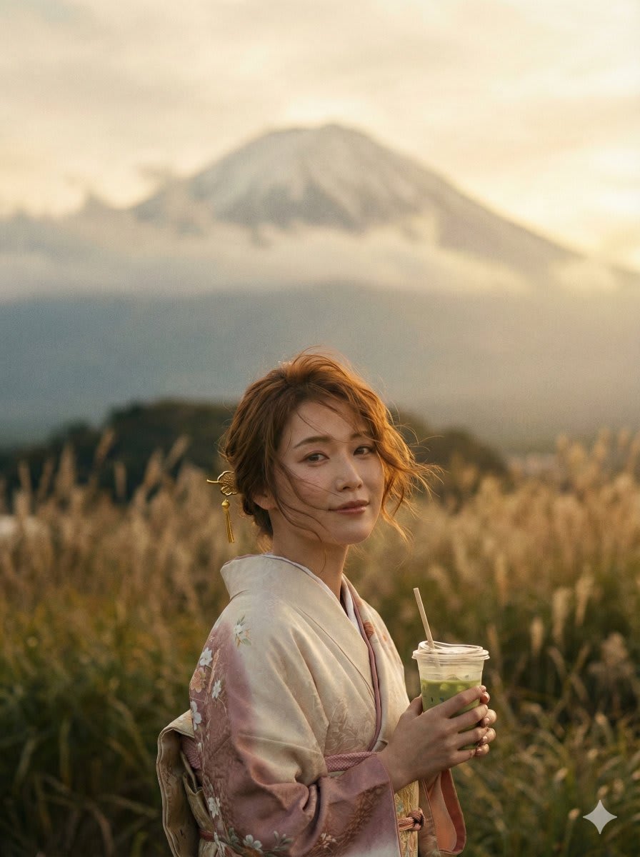 "{"subject":{"description":"25-year-old Japanese woman with a curvaceous figure, standing in a meadow before Mount Fuji, gentle breeze lifting her hair","pose":"relaxed stance, one hand holding an iced matcha latte, the other resting on her kimono; graceful posture, soft gaze toward camera","expression":"serene, warm eyes, gentle closed-lip smile","hair":"warm brown, long and straight, wind-tousled","clothing":{"kimono":{"type":"traditional furisode","color":"soft ivory with dusty rose accents","details":"delicate floral embroidery, pale pink obi, flowing sleeves catching the breeze"}},"makeup":"natural, dewy skin, glossy nude lips"},"accessories":{"hair":"gold kanzashi hairpin with floral ornament","jewelry":"simple pearl drop earrings","prop":"iced matcha latte in clear cup"},"photography":{"style":"cinematic arthouse film still","framing":"long shot, subject small in frame occupying lower third, generous negative space above","composition":"rule of thirds, subject off-center left, Mount Fuji anchoring the right","depth_of_field":"shallow focus, foreground grass blurred, creamy bokeh","lens":"vintage 50mm anamorphic, subtle flare, soft vignette","aspect_ratio":"3:4"},"color_grading":{"style":"lo-fi analog film ā lifted blacks, desaturated muted tones, warm amber-sepia cast, flat contrast, hazy softness, visible grain, sun-bleached 1970s warmth"},"background":{"setting":"open meadow at base of Mount Fuji, golden hour","elements":"tall wild grasses, scattered wildflowers, morning mist on slopes, atmospheric haze creating depth layers","lighting":"soft golden backlight, gentle rim light on hair, blooming highlights, no harsh shadows"},"mood":"quiet nostalgia, contemplative, poetic, Wong Kar-wai stillness"}"