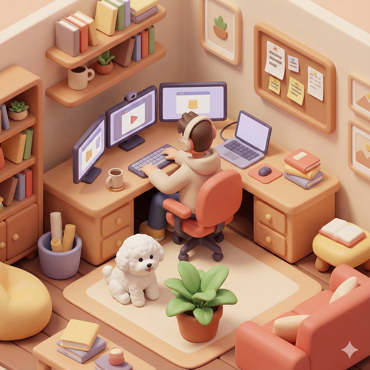 "Based on you know about me, generate a 3D isometric colored illustration of me working from home, filled with various interior details. The visual style should be rounded, polished, and playful. --ar 1:1