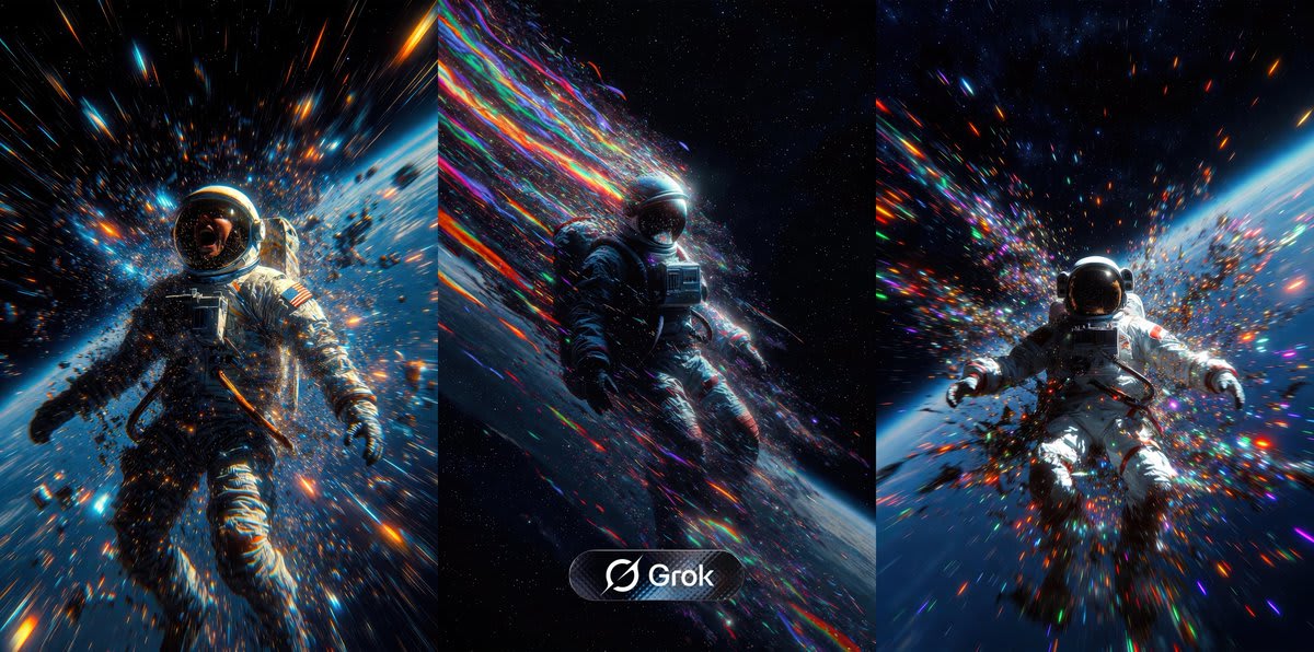 "A highly detailed, cinematic digital artwork of a lone astronaut in a futuristic white spacesuit, standing dynamically in the vast emptiness of outer space. The suit is textured with intricate folds, armored panels, and glowing accents, catching ethereal light. The astronaut's helmet visor reflects a golden sunrise-like glow from an unseen star, with subtle cracks and digital glitches distorting the reflection. The figure appears to be disintegrating or dissolving into vibrant particle trails and motion blur effects, exploding outward in a burst of multicolored neon fragments intense blues, electric purples, fiery oranges, and sparkling golds trailing behind like cosmic dust and energy waves. Subtle glitch artifacts and scan lines add a cyberpunk, retro-futuristic vibe. The background is an infinite black void of space, dotted with faint distant stars and nebulae for depth. Render in ultra-high resolution, photorealistic with surreal elements, dramatic volumetric lighting, sharp focus on the astronaut, bokeh effects on particles, 4k HDR."