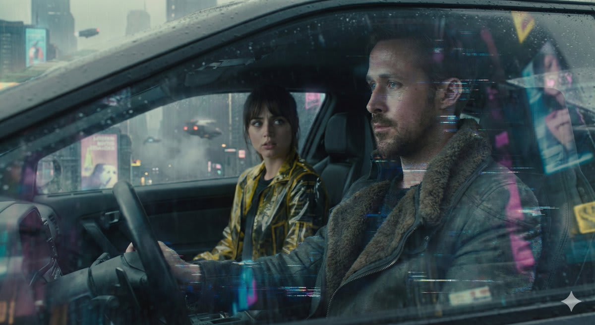 "{"image_description":"A medium close-up cinematic still from the movie 'Blade Runner 2049'. Inside a futuristic vehicle, a man and a woman are seated. The man, Ryan Gosling as Officer K, is in the driver's seat in the foreground, wearing a dark, heavy, shearling-lined coat. He has a beard and looks pensively to the side. The woman, Ana de Armas as Joi, is in the passenger seat, looking towards the man. She wears a distinctive, translucent yellow and black jacket with a digital, pixelated pattern that catches the light. The interior of the car is dark and utilitarian. Rain streaks are visible on the window between them, blurring the grey, overcast landscape outside. The lighting is diffused and moody.","characters":[{"name":"Man (Officer K)","actor":"Ryan Gosling","position":"Foreground, Driver's seat","clothing":"Dark shearling-lined coat","appearance":"Bearded, pensive expression, looking away","focus":"Sharp focus"},{"name":"Woman (Joi)","actor":"Ana de Armas","position":"Mid-ground, Passenger seat","clothing":"Translucent yellow and black digital-pattern jacket","appearance":"Looking at the man, dark hair","focus":"Slightly softer focus through the window"}],"setting":{"location":"Futuristic Car Interior","environment":"Rainy, overcast outdoors visible through the window"},"cinematography":{"angle":"Eye-level","lighting":"Soft, diffused, natural daylight from outside","mood":"Contemplative, melancholic, futuristic","color_grading":"Muted tones, cool color palette with pops of yellow"},"size":"Medium Close-up (MCU)","format":"Cinematic Still"}"