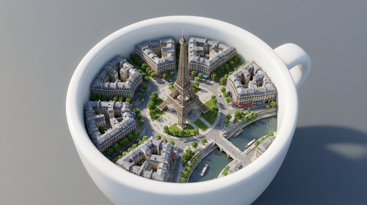 "Prompt on Nano Banana Pro : White ceramic coffee cup rests on a smooth gray surface, its interior transformed into a miniature version of Paris. Instead of liquid, the cup contains tiny detailed streets, Haussmann-style buildings with gray rooftops, tree-lined boulevards, and small cafés with awnings. At the center rises a perfectly scaled Eiffel Tower, made of intricate metallic latticework, towering over a circular plaza and grassy park with tiny walking figures. Bridges span across a tiny river resembling the Seine that curves through the cup, with miniature boats floating beneath. The perspective is top-down, with gentle depth-of-field blur at the cup’s edges, focusing sharply on the Eiffel Tower as the focal point. Soft daylight casts realistic shadows, and the city textures—cobblestone streets, glass windows, and greenery—appear ultra-detailed, giving the illusion of a living Paris contained within a cup."