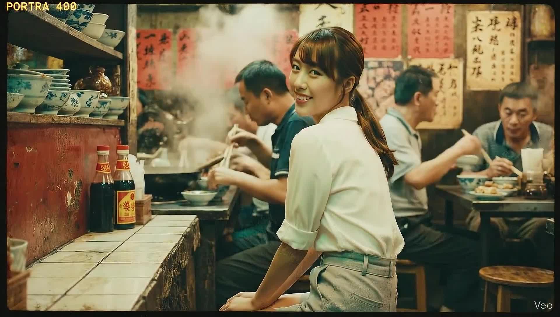 "cinematic nostalgic realism; a young beautiful Chinese woman with soft dark brown hair tied loosely in a low ponytail, gentle face-framing bangs, and a warm natural smile, sits sideways on a narrow wooden stool inside a tiny, crowded Chinese restaurant. She turns back toward the camera with calm curiosity and softness in her expression. She wears a white blouse and light gray high-waisted shorts, her posture relaxed yet elegant. Around her, several middle-aged Chinese men in short-sleeve casual shirts are chatting quietly over small dishes and baijiu. The restaurant interior feels narrow and warmly cluttered — walls covered with old red menus, faded posters, and handwritten food prices; shelves stacked with ceramic bowls, soy sauce bottles, and small ornaments. A faint haze drifts through the air, illuminated by soft warm tungsten light mixed with a touch of greenish cast, evoking the smoky scent of stir-fried food and nostalgia. The atmosphere feels intimate, authentic, and deeply human — a candid 1990s Chinese urban night moment captured with gentle cinematic realism."