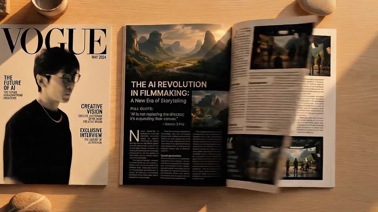 "The camera begins with a slow, deliberate top-down angle focused on a closed Vogue magazine resting on a warm wooden table, the cover featuring a posed man wearing glasses and a dark shirt. A gentle, ambient breeze stirs the room, causing the pages of the adjacent open magazine to flutter softly, the wind-driven motion unfolding with a calm, unhurried rhythm."