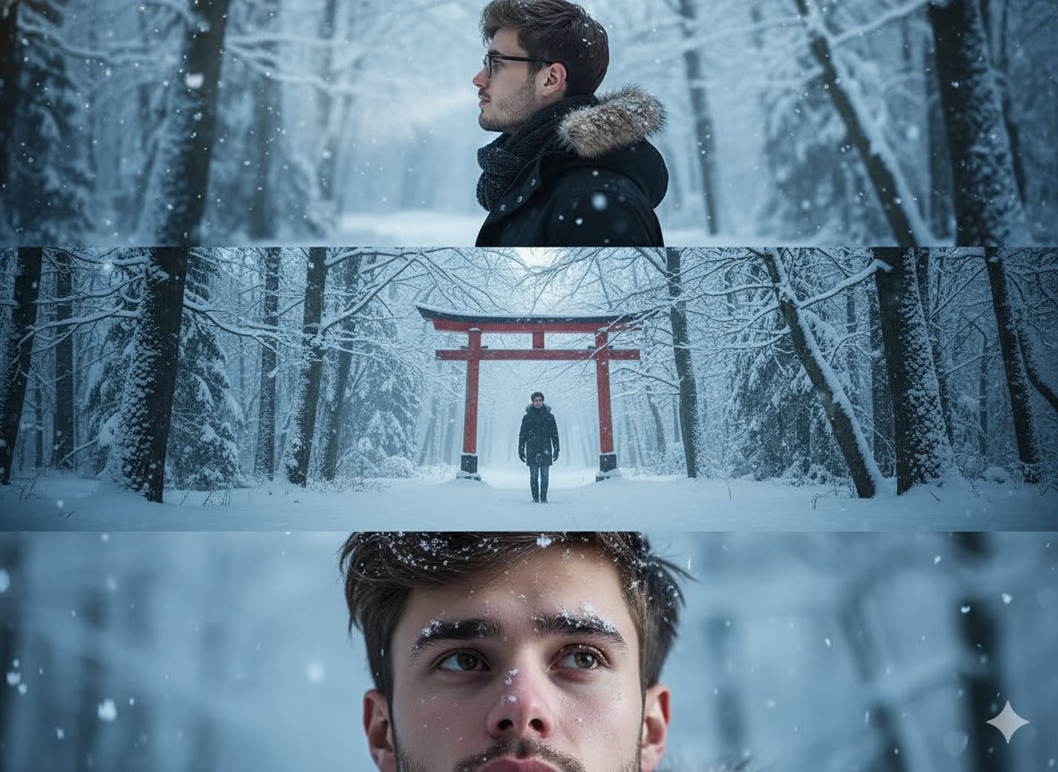 "Scene_Description": "Three connected ultra-realistic photographic frames depicting a cinematic winter moment of solitude and reflection.",