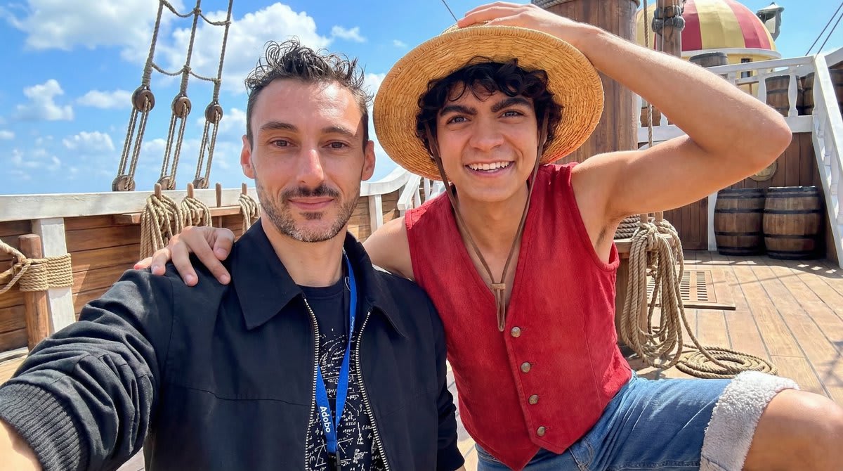 "Place Monkey D. Luffy next to the man, smiling widely with his straw hat tilted. Use a Thousand Sunny deck background with bright blue sky. Keep the selfie composition intact and integrate both characters naturally."