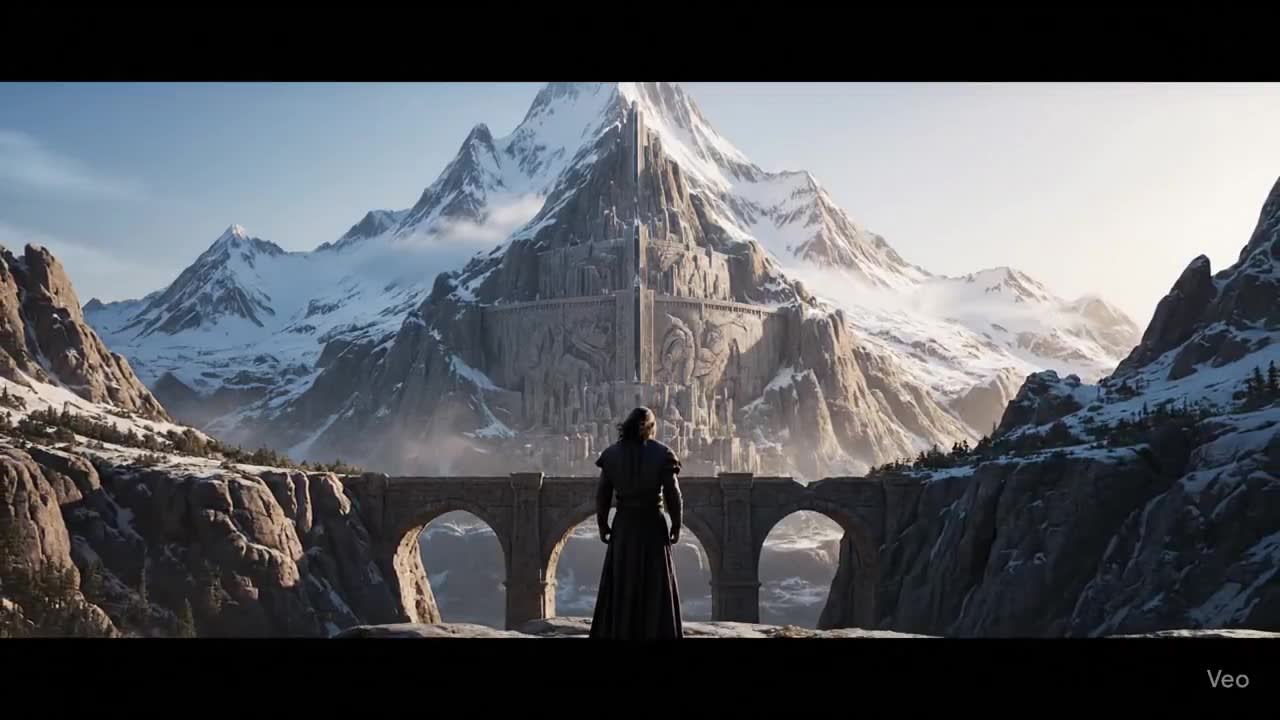 "A hyper-realistic, epic cinematic video captures a lone figure standing before a stone bridge leading to a magnificent, ancient citadel built into a snow-capped mountain. The camera performs a slow, majestic crane shot, rising and pushing in to reveal the full scale of the citadel with its turquoise domes and intricate carvings. The scene is set in a crisp mountain pass, with soft, late-afternoon sunlight casting long shadows. The figure's robes flutter gently in the wind, and they take a single, slow step onto the bridge. The audio is an atmospheric mix of wind whistling through the mountains, the distant cry of a bird, and a low, majestic choral drone, creating an awe-inspiring and serene mood."