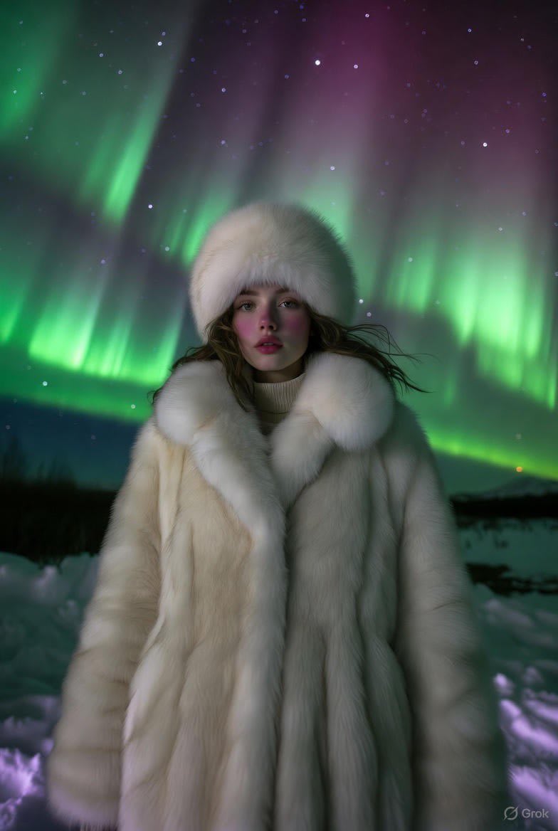 "{'type': 'night photo', 'subject': {'description': 'A young woman (from the reference image)', 'attire': 'stylish white long-fur coat and a matching fur hat. The texture of the long fur catches the soft glow of the aurora, adding depth and shine.', 'features': 'cheeks are pink from the cold, hair slightly tousled by the wind', 'pose': 'stands on snowy ground'}, 'setting': {'environment': 'snowy ground', 'sky': 'vivid northern lights glowing in green and purple tones above her', 'details': 'snow sparkles with small realistic tiny reflections'}, 'lighting': {'overall': 'natural', 'sources': 'soft light from the aurora and faint moon glow', 'effect_on_subject': 'softly illuminating her face'}, 'style_and_execution': {'realism': 'highly realistic', 'detail': 'crisp detail, save natural texture', 'camera_emulation': 'authentic iPhone night exposure with slight lens flare', 'mood': 'serene, cinematic, cold beauty'}, 'technical_specs': {'camera': 'iPhone 15 Pro Max', 'mode': 'ProRAW'}}"