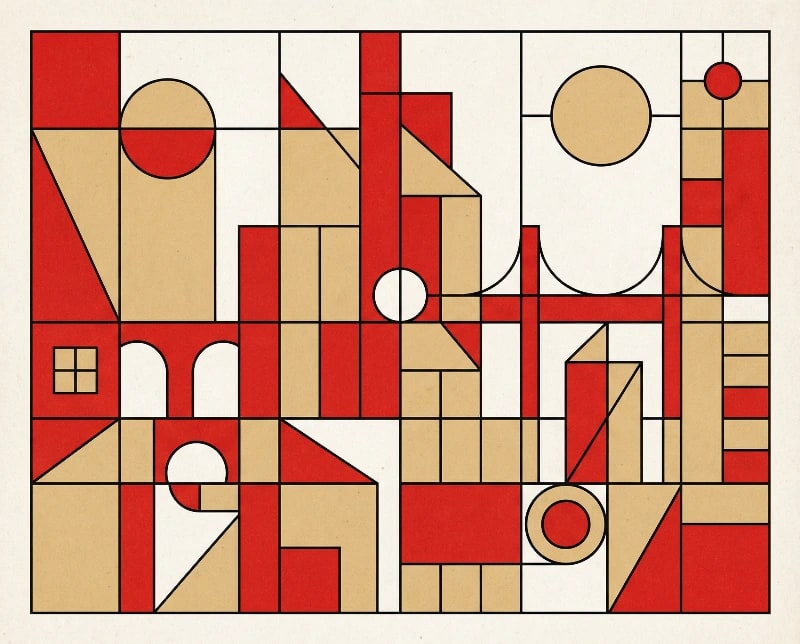 "A Geometric Bauhaus Composition of [a modernist city skyline], featuring clean lines, simple shapes, and a harmonious color scheme. Utilize a contrasting color palette of [primary red] and [warm beige] to create a sense of order and balance."