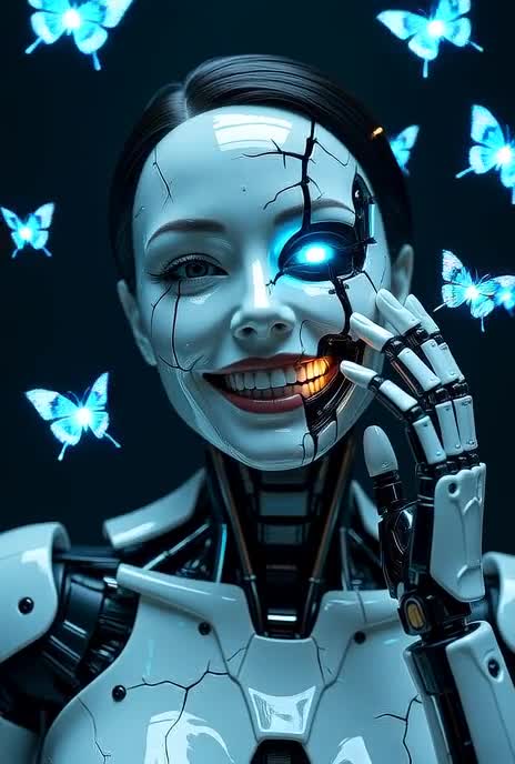 "portrait shot of a female cyborg in a dark void, her cracked porcelain mask slipping halfway off to reveal glowing blue eye and human skull beneath exposed wiring. She wears a haunting, wide smile clearly not from joy but programming. A single black oil tear runs down her cheek. Digital butterflies made of glitchy light flicker around her. Her hands are damaged. The style is hyper-realistic digital art with glitchcore overlays and emotional horror aesthetics."