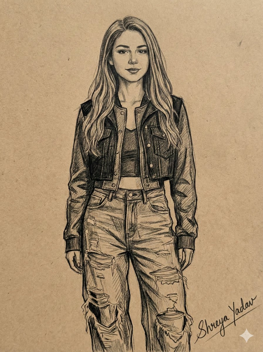 "A young woman illustrated in a pencil-sketch style on kraft paper. Maintain the original face exactly as in the provided image (no changes). She wears a mixed-material outfit: a black cropped vest layered over a jacket, a dark crop top, and extremely baggy, heavily distressed, ripped blue denim jeans. The artwork features high contrast, bold linework, and clean shading throughout. Image Ratio 3:4."