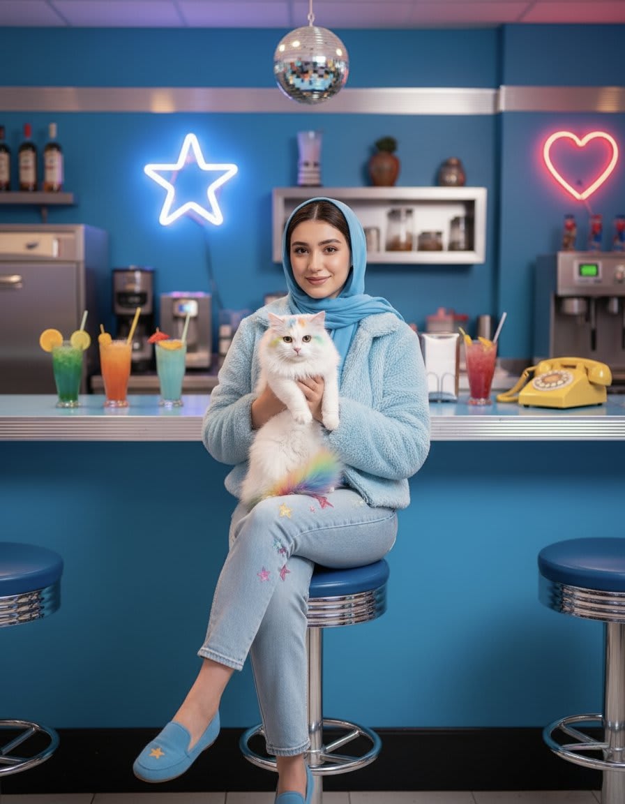"pose": "seated at a diner-style counter, center frame",