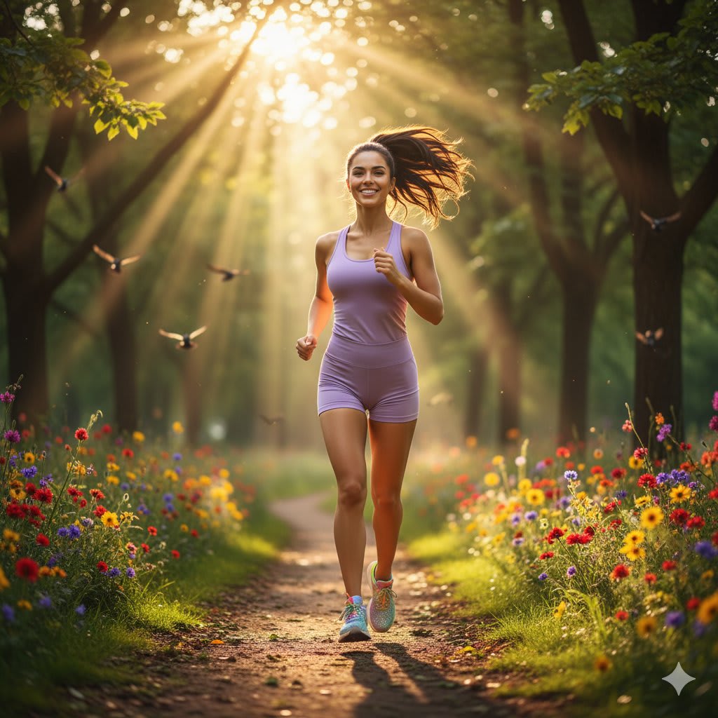 "A young woman jogs confidently along a winding park trail the sunlight dappling her path through the trees. She wears a fitted sports tank top in soft lavender and matching athletic shorts with bright sneakers that catch the light. Her ponytail bounces with each stride and her face is lit with a radiant smile that reflects the joy of movement. The surrounding park is alive with the bright colors of wildflowers and the sounds of birds chirping. The sun’s warmth touches her skin as she moves fluidly exuding a sense of strength vitality and connection to the natural world."