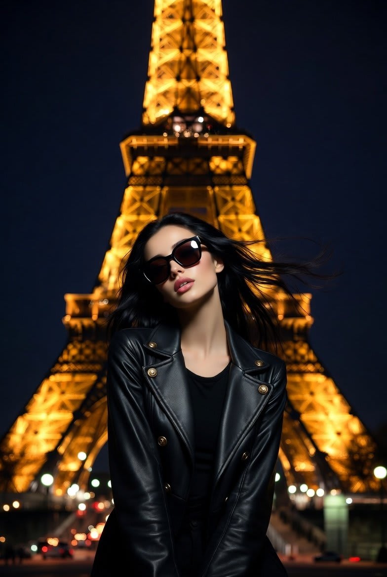 "A stylish and elegant woman with sunglasses featuring yellow or orange lenses and a dark frame. She wears a black silk blouse with a few unbuttoned buttons, revealing delicate gold necklaces. Over the blouse, she has a black blazer with shiny satin lapels. The lighting is nocturnal and dramatic, with the Eiffel Tower illuminated in the background, casting a warm glow over the dark sky. She stands on a raised balcony or terrace, overlooking the city of Paris at night, with twinkling city lights below. Her pose is contemplative, looking down or sideways, with one hand visible, nails well-groomed. The atmosphere is sophisticated and mysterious. Her face and hairstyle are preserved 100% from the reference photo provided by the user, maintaining maximum fidelity to her facial features, structure, and eye color."