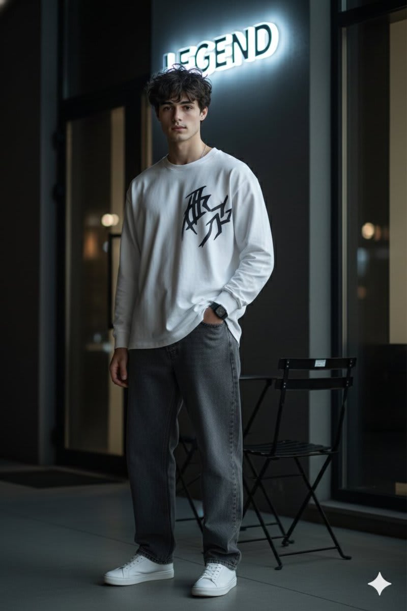 "Generate an 8K ultra realistic cinematic portrait of the subject standing casually outdoors at a night cafe named Legend. The scene is set in the outdoor area of a modern minimalist building facade, with a white illuminated sign on the wall that displays “Legend.” A black folding chair is placed casually near the subject. The lighting is nighttime with a soft ambient glow, and the illuminated sign adds a subtle rim light, creating a cool, clean, modern night ambience. The subject must keep the same facial features and hairstyle as the reference image, standing in a relaxed confident posture beside or near the folding chair, with disheveled spiky hair and a natural expression. He wears a half white oversized shirt with a cool modern design, loose gray oversized baggy jeans, clean white sneakers, and a modern smartwatch. The visual style is 8K ultra realistic with a cinematic nighttime street style look, soft cool night tones, and light contrast from the signage. Preserve sharp fabric textures, realistic skin and hair detail, accurate lighting reflections, and crisp modern building surfaces. Output as a full body photorealistic editorial grade image."