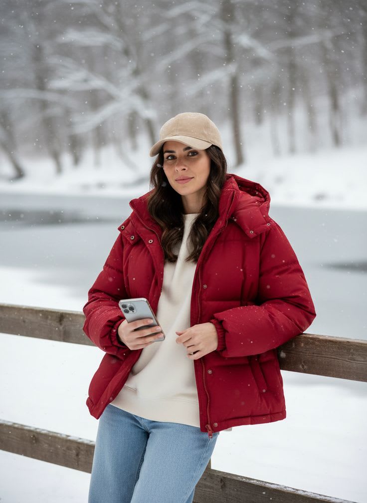 "A woman stands calmly in a snowy winter landscape, wearing a warm red puffer jacket and a beige cap. Soft snowflakes fall around her as she leans casually against a wooden railing. A frozen lake and blurred winter trees create a serene, peaceful background. She holds a smartphone in her hand, capturing the quiet beauty of the moment. Her relaxed posture and gentle expression reflect comfort and confidence. The red jacket adds a striking contrast against the white snow. The overall mood is cozy, calm, and winter-inspired. This scene feels perfect for a lifestyle, fashion, or winter season photoshoot."