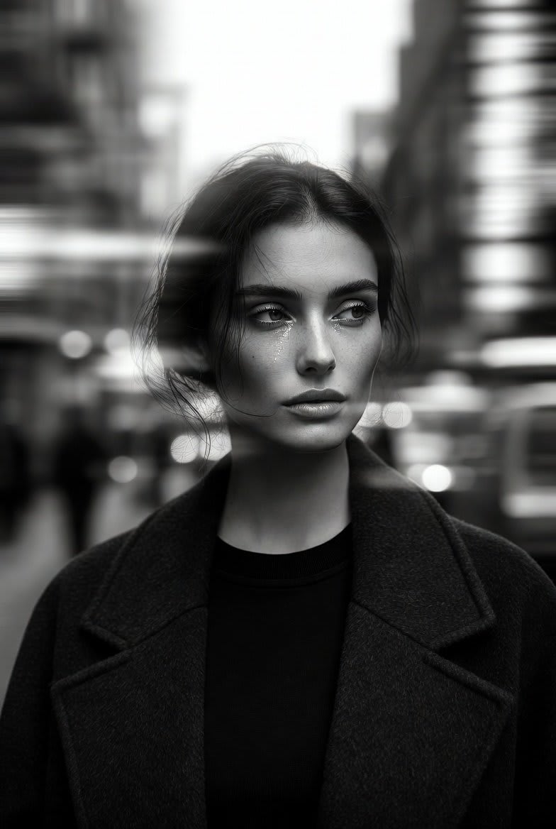 "lighting": "Soft, dramatic lighting (highlights cheekbones and eyes, subtle shadows)",