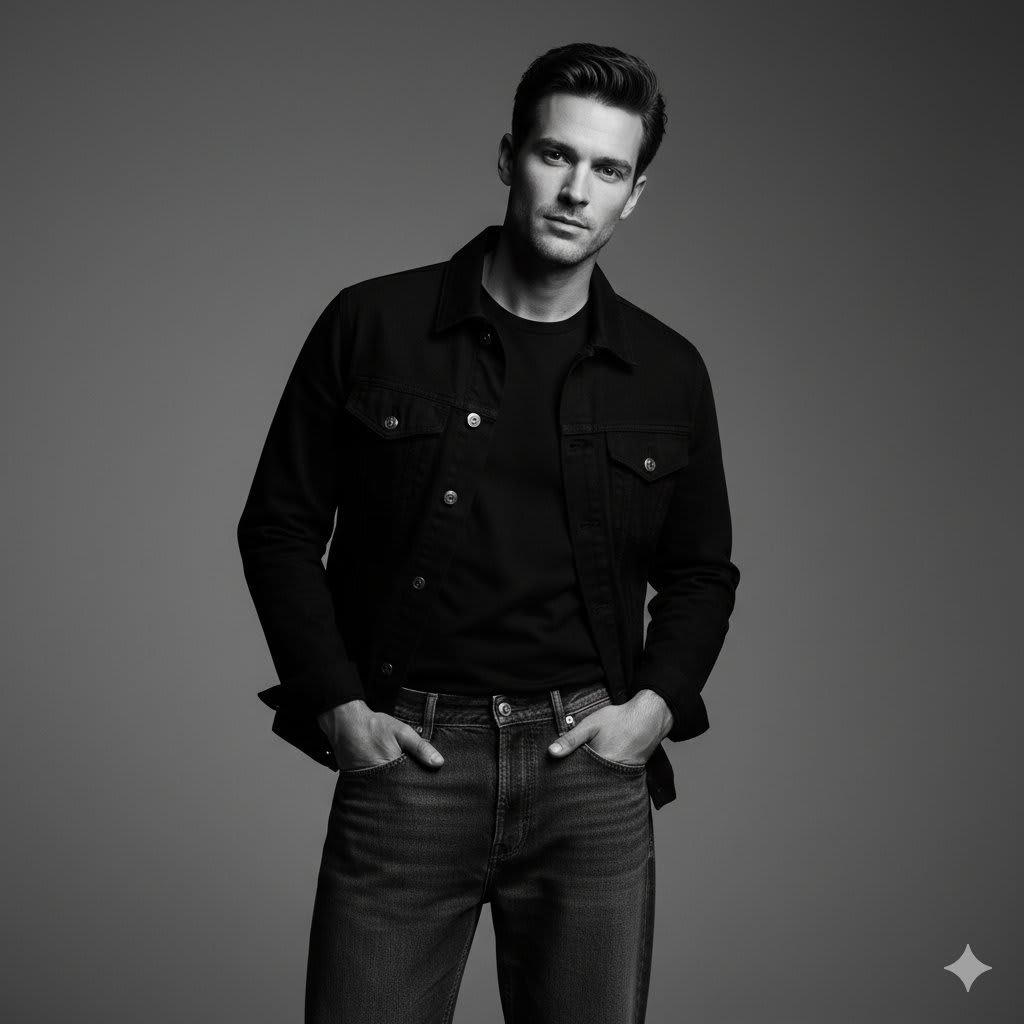 He is wearing relaxed-fit jeans (not tight) paired with a stylish black shirt or jacket, creating