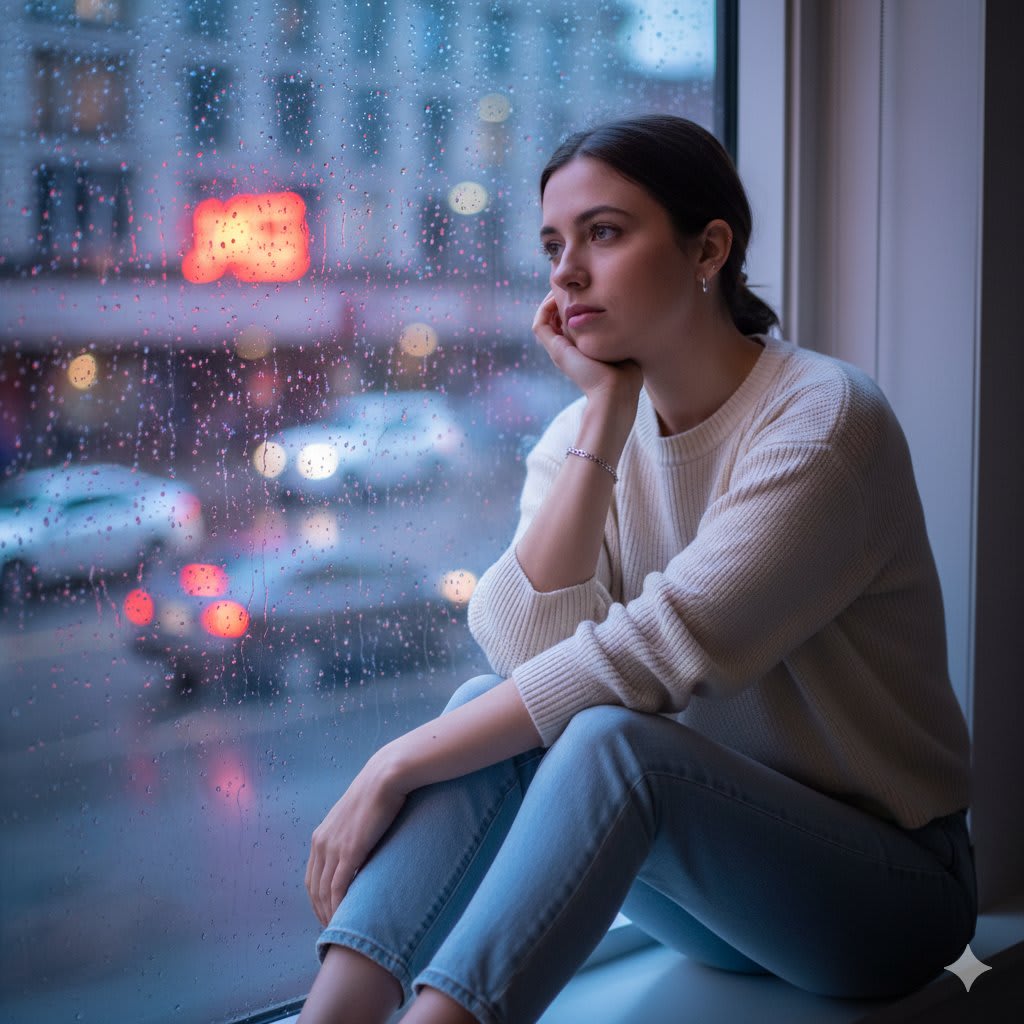 "description": "A medium shot of a young woman sitting by a rain-soaked window, lost in thought as city lights blur in the background.",