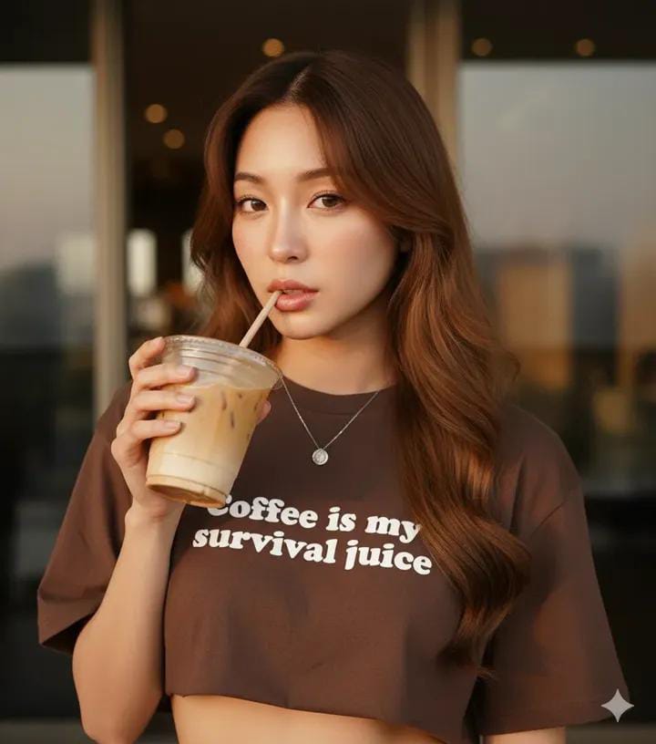 feathery lashes. She has a natural, soft pink blush on her cheeks and a glossy pink lip color. She is wearing a loose brown cropped midriff t-shirt that says "Coffee is my survival juice" in a retro medium sized font. She wears a delicate silver chain necklace with a small circular pendant. She is holding up a cup of iced latte with straw. The background is softly blurred, showing hints of a modern balcony with reflective surfaces and warm lighting. The overall lighting is soft and even,