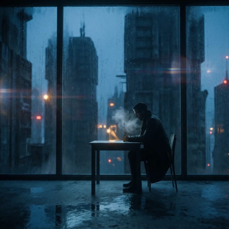"Officer K, profound solitude captured in cinema, hyper-real film still drenched in emotional weight, cold blue hour lighting with dying warmth at the edges of a decaying megacity, rain-streaked glass creating liquid distortions across a fogged apartment window, shallow depth of field isolating the lone figure against towering shadows, muted desaturated palette punctuated by a single amber holographic glow, slow-motion implied stillness, fine analog grain reminiscent of 1970s existential cinema despite a futuristic setting, lens flares bleeding into darkness, ray-traced reflections in pooled rainwater on concrete floors, breath visible in cold recycled air, negative space dominating the frame, crushing atmospheric pressure, intimate yet distant camera positioning, Vilmos Zsigmond-inspired melancholic cinematography, the weight of unspoken grief."