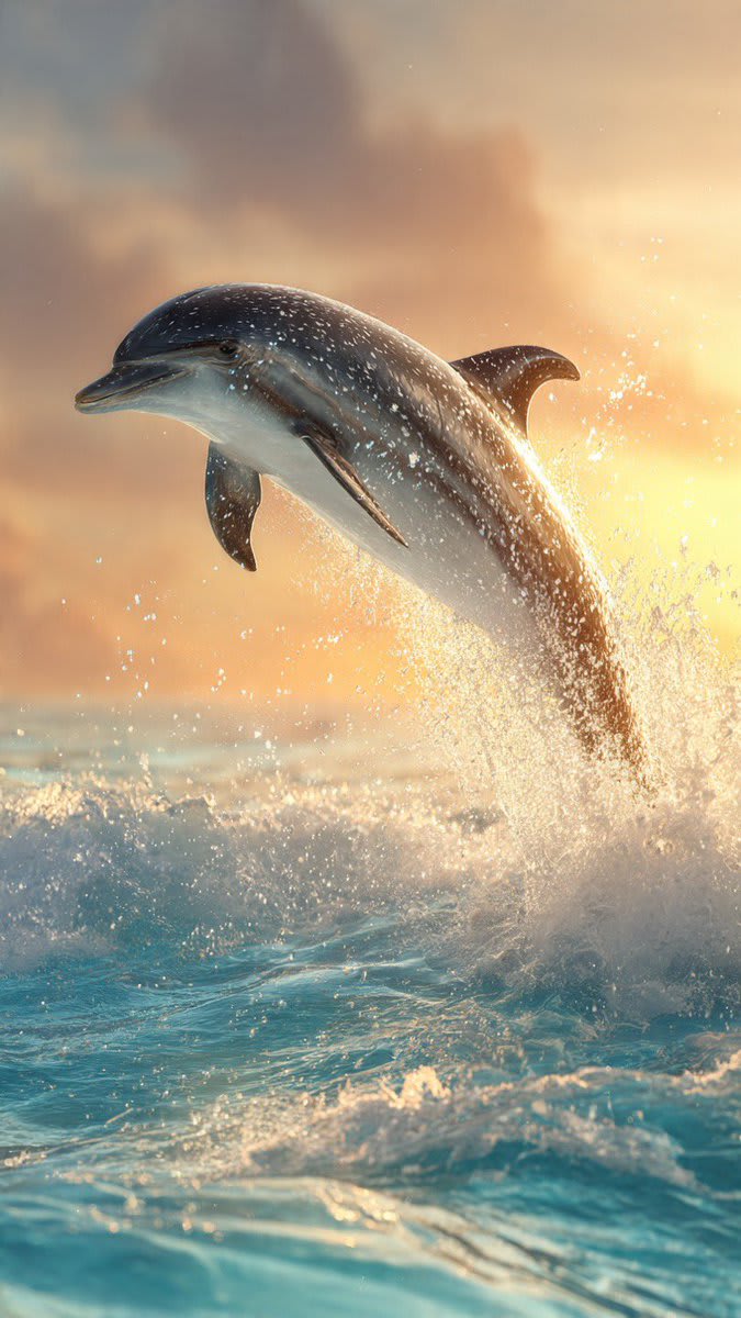 "prompt": "Ultra-realistic cinematic image of a dolphin leaping gracefully out of the turquoise ocean at full height. The dolphin has smooth white and black skin with fine speckled patterns along its sides, glistening in bright sunlight. Droplets of water scatter through the air, glowing in golden light as the dolphin arcs above the waves. The scene is bathed in vivid color — crystal-clear blue water, sunlit reflections, and radiant warm tones from the sky. The ocean surface ripples below with dynamic splashes and foam. The atmosphere feels joyful, fresh, and full of movement, like a perfect summer morning at sea. 9:16 aspect ratio, strong contrast, bright and clean cinematic lighting, ultra-detailed water texture.",