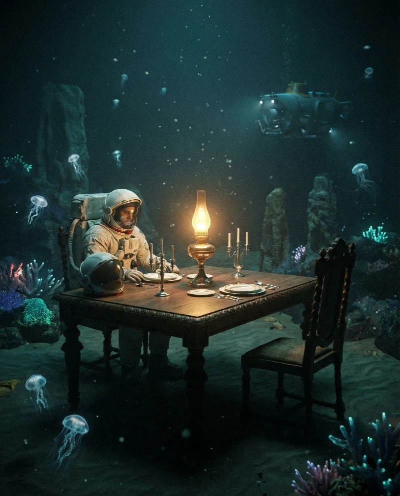 "A 1970s astronaut sitting alone at a fully set Victorian dining table on the deep ocean floor, illuminated by a single glowing lamp, bioluminescent deep-sea environment, extreme isolation, octane render."