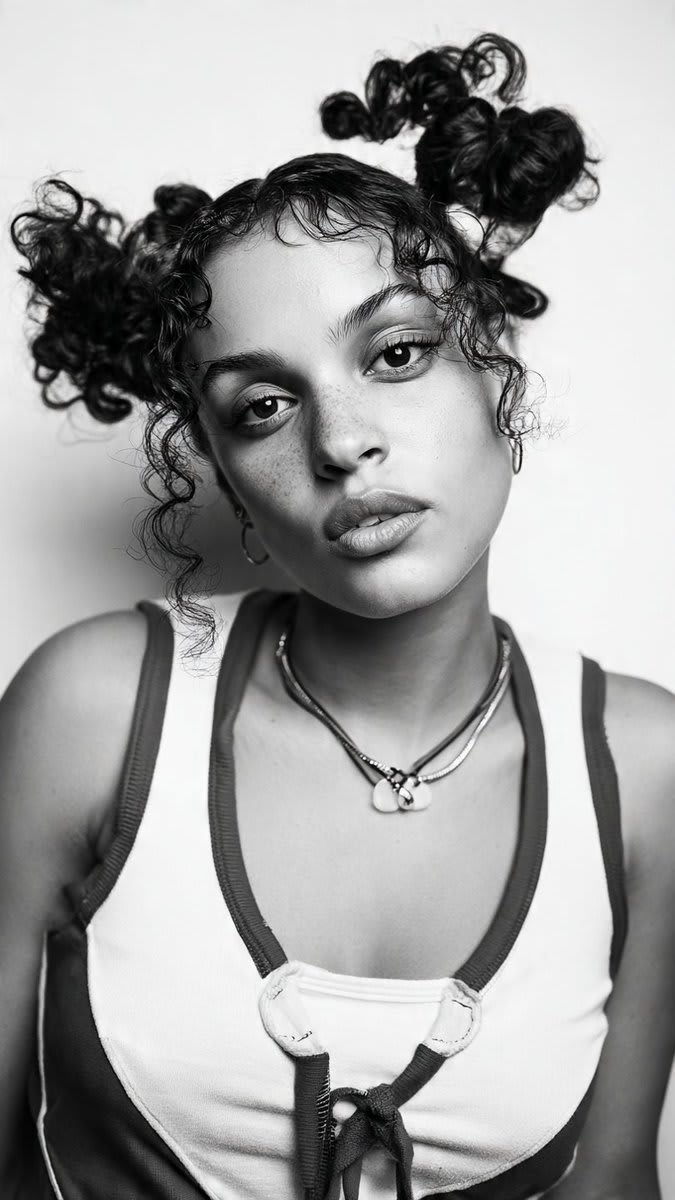 "a beautiful VOGUE editorial portrait of a 1990s RAVER woman, looking defiantly into the camera wearking a 90s tracksuit and hair bunches, white vest, on a white seamless backdrop, photographed in punk fanzine photocopy zine style, high-contrast black and white, ultra-sharp fashion editorial portrait, Hasselblad H6D with 80mm lens, f/2.8, ISO 100, cinematic lighting, super crisp focus, realistic pores and texture, Vogue cover composition, Ilford HP5 film look, stencil edge texture, bold graphic contrast, Prefab77 street art aesthetic, rebellious elegance, timeless style"
