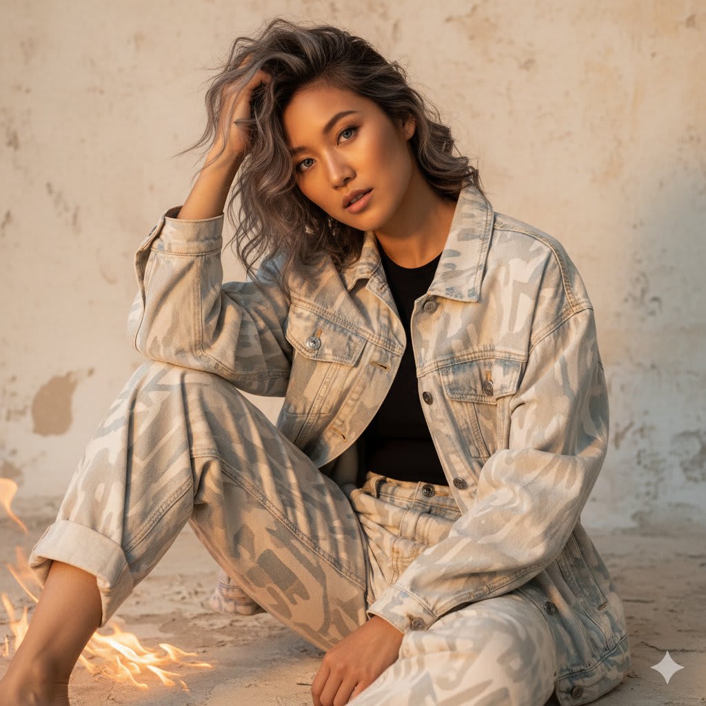 "styled for women. Her pose is stylish and confident. The studio background is soft cream-beige with a broken or textured wall/floor surface. Warm firelight adds depth, highlighting her tousled hair with soft waves and subtle grey highlights. Her eyes are grey, expressive, and captivating. One hand rests casually while her fingers interact naturally with her hair or clothing. Hyper-detailed, cinematic editorial style, capturing fashion, attitude, and personality."