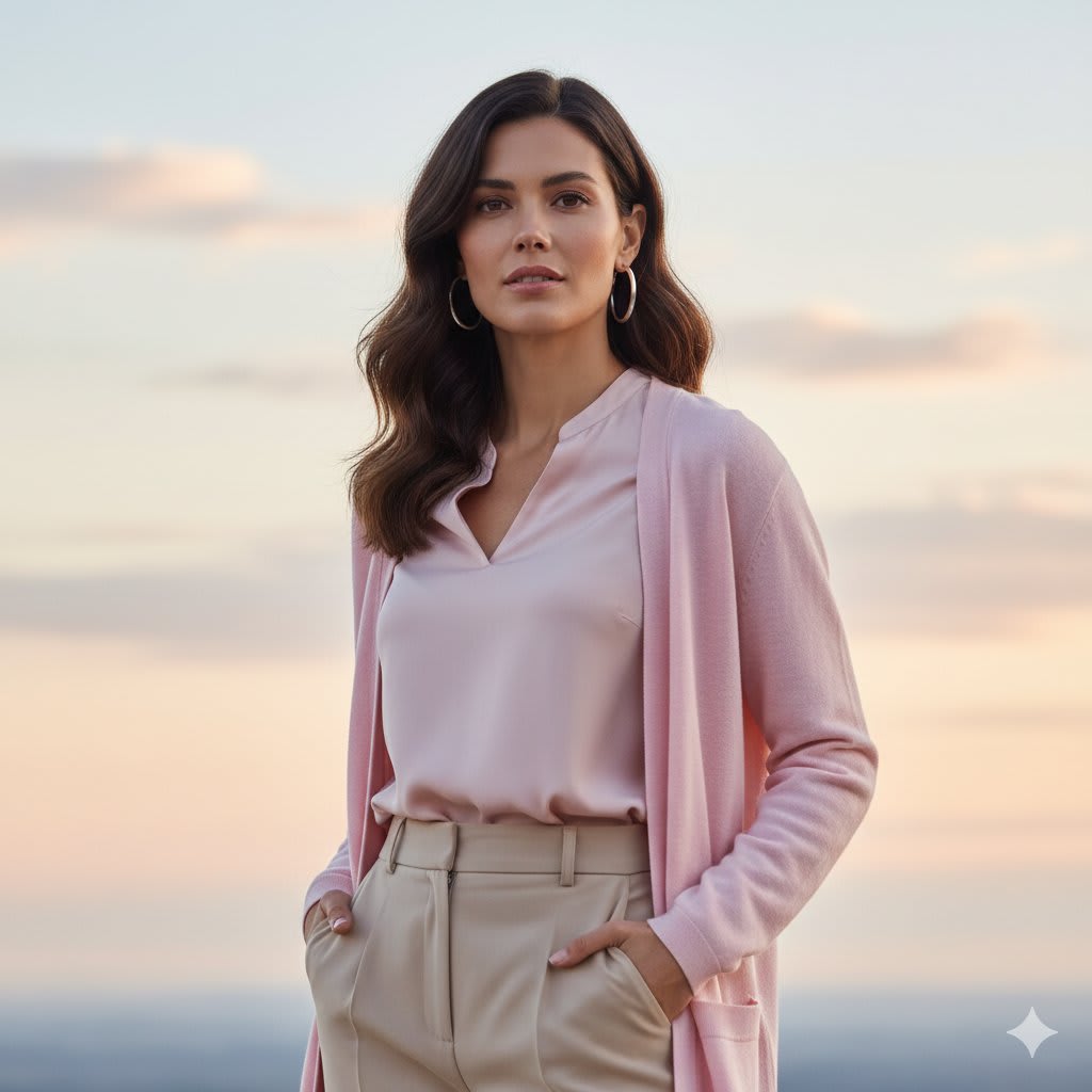 "Ultra-realistic editorial portrait of a confident, attractive woman with dark brown hair styled in loose waves, wearing large silver hoop earrings. She is dressed in a soft, pastel-colored outfit perfect for a fresh morning vibe, consisting of a light pink silk blouse, high-waisted beige trousers, and a matching light pink cardigan. The model strikes a relaxed but confident pose, standing with both hands gently placed in her pockets, a calm yet assertive expression on her face as she looks directly at the camera. The background is a serene early morning scene: a soft sunrise sky with shades of pale pink, orange, and light blue, with hints of mist and light clouds. The lighting is soft and natural, creating a fresh, warm atmosphere that gently illuminates her face. The photo captures a peaceful, optimistic vibe with a touch of elegance, perfect for a morning fashion editorial."