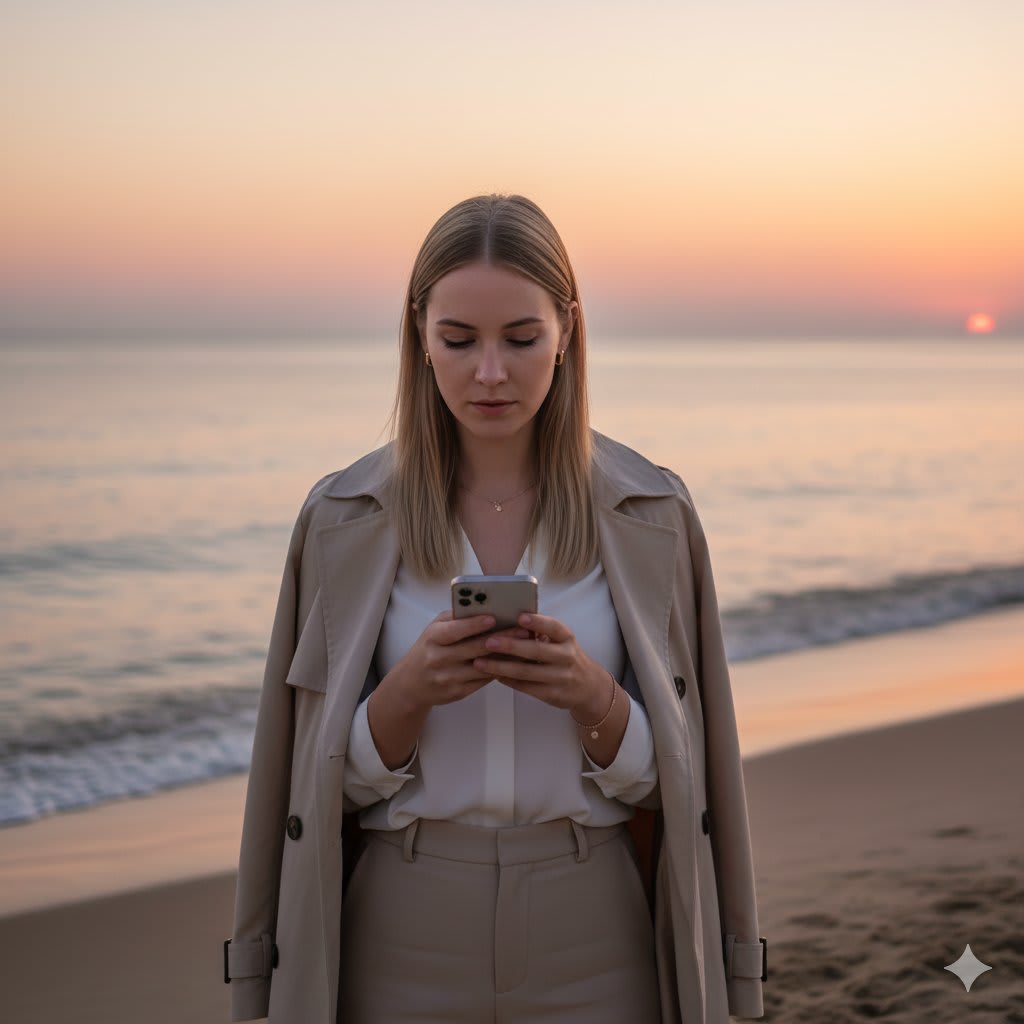 Her fair skin is kissed by the golden light of the setting sun, and the glow from her phone screen softly illuminates her focused face. The entire scene captures a peaceful moment of quiet connection, blending natural beauty with refined style against the serene backdrop of the beach at sunset."