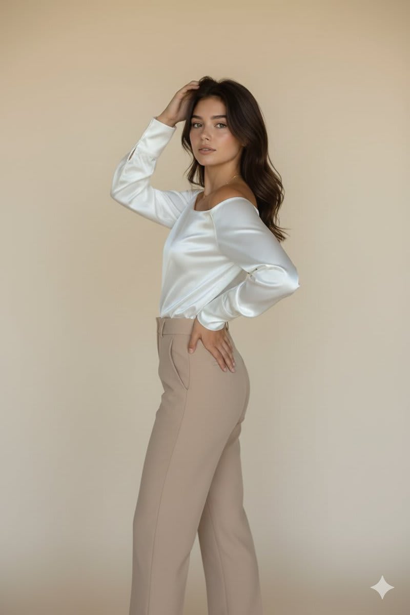 "type": "white satin off-shoulder blouse",