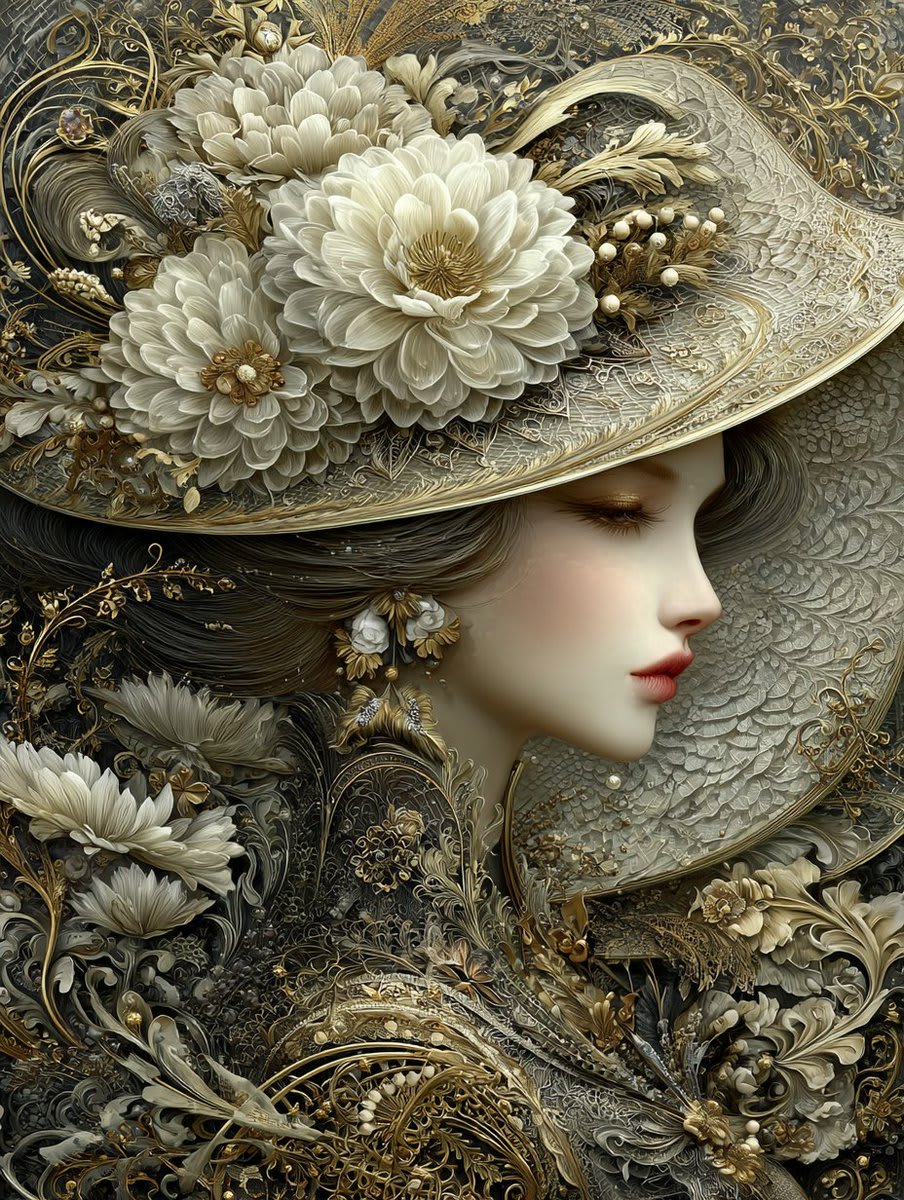 "A stunning art nouveau portrait of an elegant woman in profile, eyes gently closed, wearing an enormous ornate wide-brimmed hat completely covered in luxurious sculpted white and gold peonies, roses, and intricate golden filigree. Her hair and dress seamlessly blend into swirling baroque floral patterns, gold vines, pearls and lace textures. Rich monochromatic palette of ivory, champagne gold, soft antique white and deep charcoal background. Highly detailed, ethereal and dreamy atmosphere, ultra-realistic yet painterly, in the style of Alphonseides, Alfons Mucha, and modern digital fantasy artists like Lois van Baarle and James Jean, 8k resolution, cinematic lighting, intricate textures, opulent and romantic."