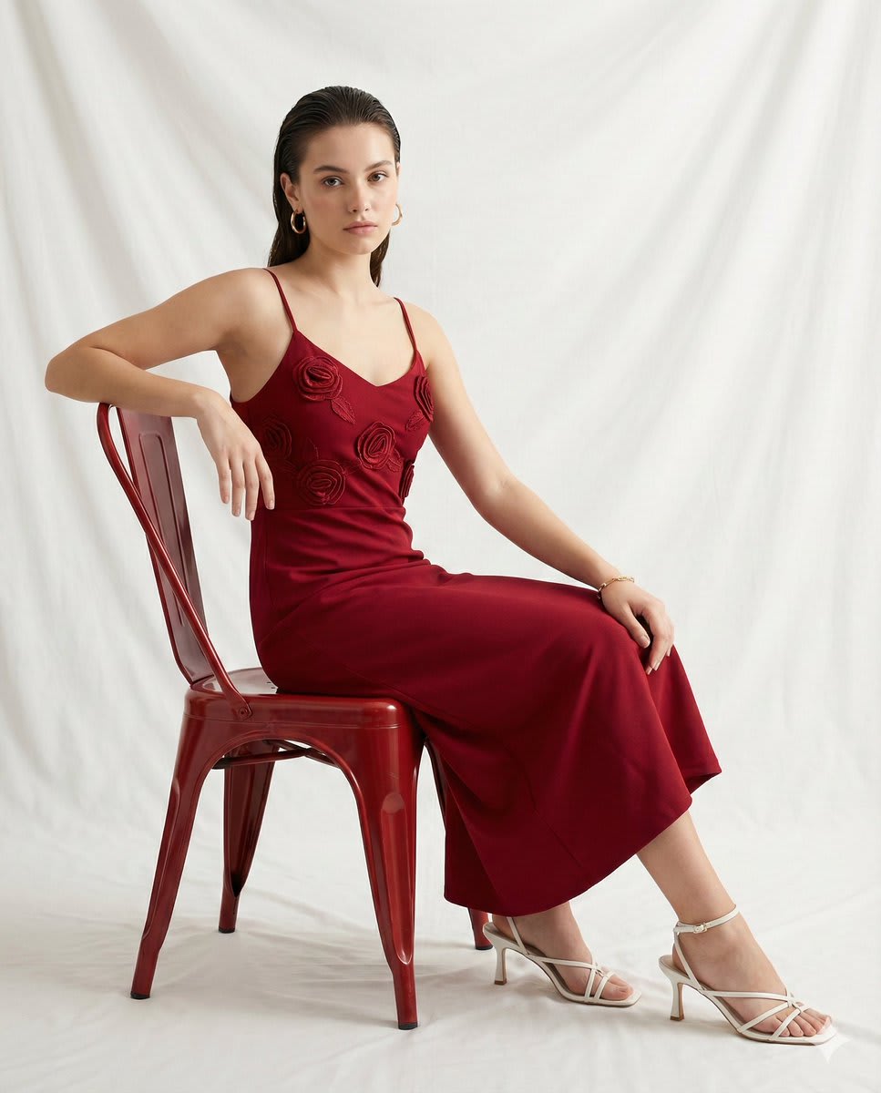 "A young, light-skinned woman sits on a glossy red metal chair positioned slightly left of center. She wears a deep red spaghetti-strap dress with rose-shaped appliqué details on the bodice. Her dark hair is slicked back, paired with gold hoop earrings and a gold bracelet. Her expression is neutral, with a direct gaze toward the viewer. She sits in a relaxed pose, one arm draped over the back of the chair and the other resting on her thigh. She wears white heeled sandals that contrast with her dress. The background is a stark white draped fabric with visible texture, creating a clean studio setting. Soft, diffused lighting highlights her features, the fabric textures, and the details of her outfit. The tone is elegant, modern, and fashion-focused. The composition is a medium shot, emphasizing her upper body, legs, and the overall styling."