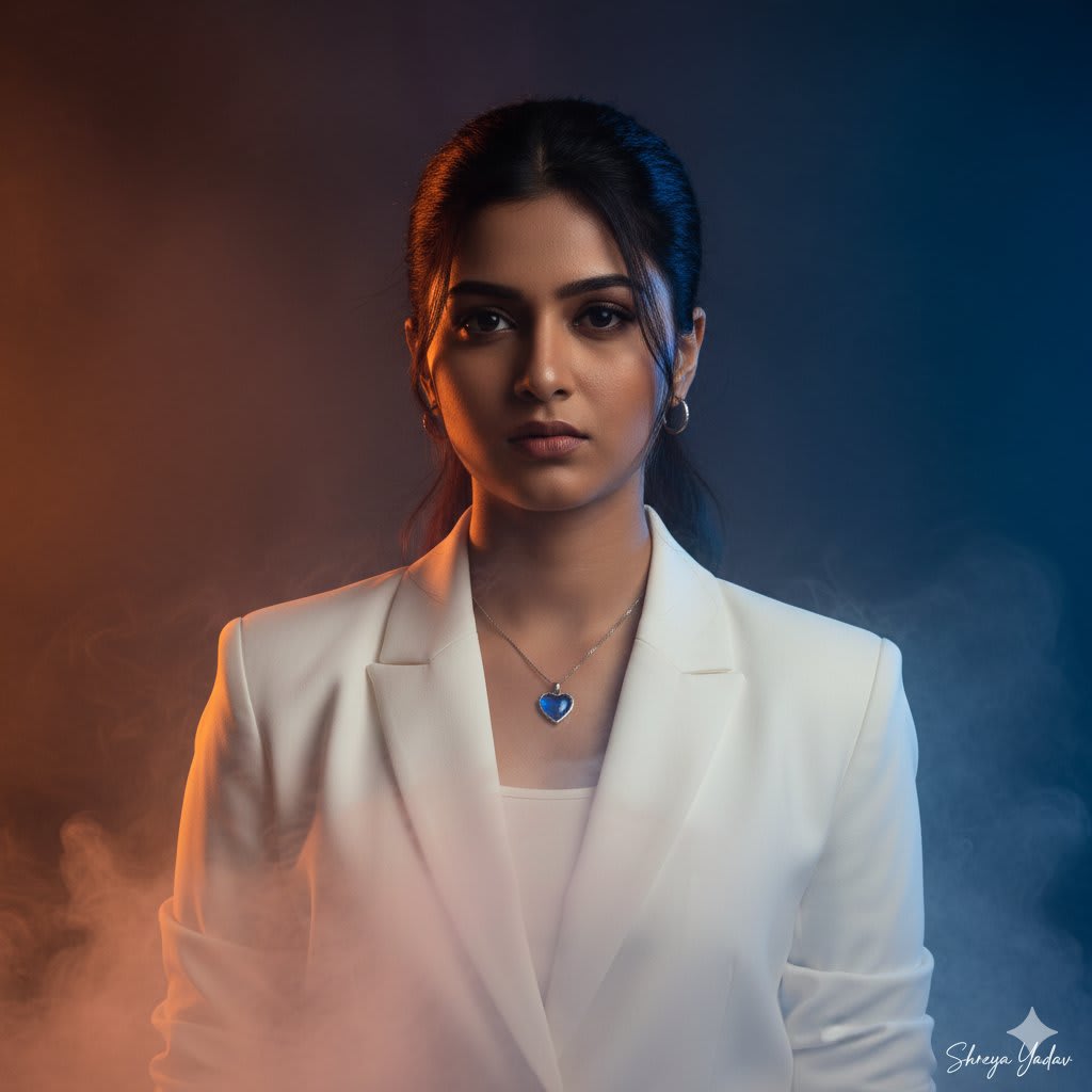 "A stunning portrait of an attractive young woman, wearing a chic, elegant white blazer over a white top. She has a serious, intense expression and her dark hair is styled in a sleek, low ponytail with a few wispy strands framing her face and slight bangs on forehead. She is wearing a noticeable blue heart-shaped pendant necklace and small hoop earrings. The smoke/fog extends into the foreground. Studio lighting, high-quality photograph, highresolution, cinematic, moody atmosphere. The background is a dramatic mix of smoky or foggy elements, intensely lit with contrasting colors: a vibrant orange/amber glow on the left and a cool, dark blue on the right"