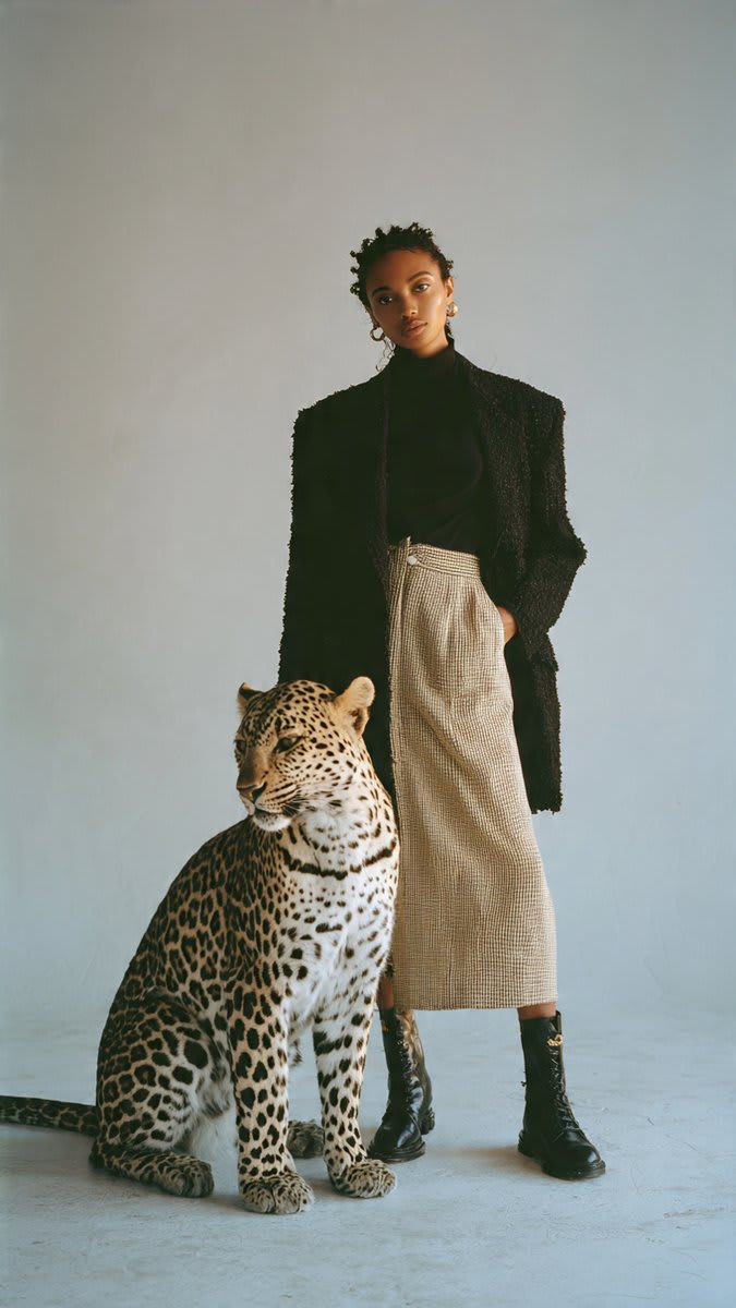 "editorial photograph of a model with highly realistic skin texture, fine lines and freckles, in a chic minimalist outfit, standing next to a relaxed leopard in a photography studio. Clean background, soft diffused light, fashion story for vogue magazine, timeless, documentary style photography, shot on portra 400 film, no plastic skin, no perfect skin"