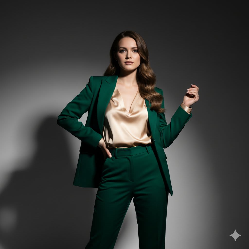 "description": "A realistic and cinematic portrait of a confident and graceful young woman standing against a striking black and white shaded background that subtly blends contrast and harmony. The scene captures the essence of timeless elegance and modern sophistication. She wears a stunning, perfectly tailored suit designed in deep emerald green and champagne gold β two colors that symbolize strength, prosperity, and refined taste. The dual tones of the suit shimmer under soft directional lighting, enhancing the luxurious texture of the fabric and drawing attention to her impeccable sense of style. Her posture radiates quiet authority and magnetic allure as she stands tall with one hand resting gracefully on her hip while the other lightly adjusts her jacket. Every element of her pose communicates confidence, independence, and feminine strength. Her hair is flawlessly styled with natural volume and soft waves, reflecting a sense of effortless charm and poise. The lighting, balanced between soft shadows and radiant highlights, beautifully emphasizes her facial features β calm, determined, and elegant. The monochrome background contrasts beautifully with the vibrant hues of her attire, making her the undeniable focal point of the image. The entire scene evokes an aura of ambition, success, and inner peace β a celebration of self-assured beauty and resilience.",