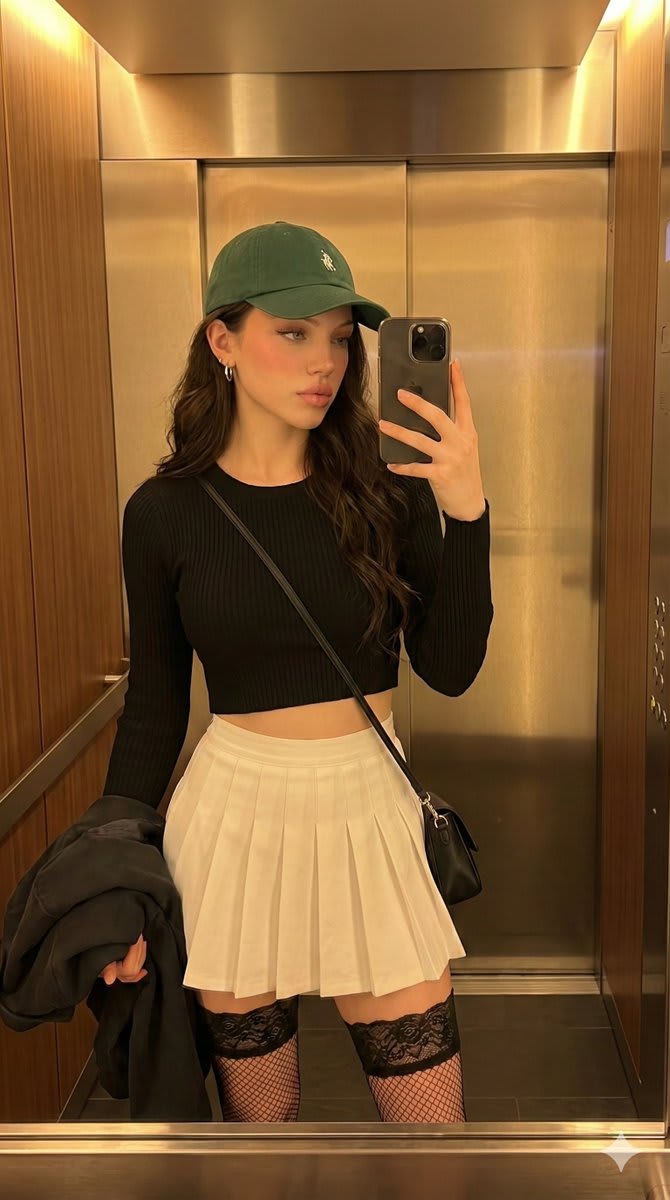 "{'scene': {'location': 'Inside a warmly lit apartment elevator, showing wood paneling and brushed metal surfaces.', 'lighting': 'Soft, warm overhead elevator light casting a golden glow.', 'atmosphere': 'Intimate, quiet, candid moment between floors.'}, 'camera': {'type': 'Mirror selfie taken with a smartphone, visible in the reflection.', 'angle': 'Chest-level, slightly angled downwards.', 'framing': 'Full-body view of the subject in the elevator mirror.'}, 'subject': {'pose': 'Standing facing the mirror with hips angled, weight on one leg, relaxed energy. Right hand holds the phone, left arm carries a draped jacket.', 'expression': "Looking directly at the camera with soft, knowing 'doe eyes', a pink flush on cheeks, and glossy, slightly parted pink lips.", 'hair': 'Long, wavy platinum blonde hair falling from under a cap.'}, 'outfit': {'headwear': 'Forest green baseball cap worn forward.', 'top': 'Black fitted ribbed knit cropped long-sleeve shirt.', 'bottom': 'White high-waisted pleated tennis skirt.', 'legwear': 'Black fishnet thigh-high stockings with a lace top, showing a gap of bare skin.', 'jacket': 'A dark jacket draped over the left forearm.'}, 'accessories': {'bag': 'Small black crossbody bag with a strap.', 'jewelry': 'Small silver hoop earrings, a thin silver necklace.'}, 'style': 'Candid, natural, intimate, warm tones, soft focus.'}"