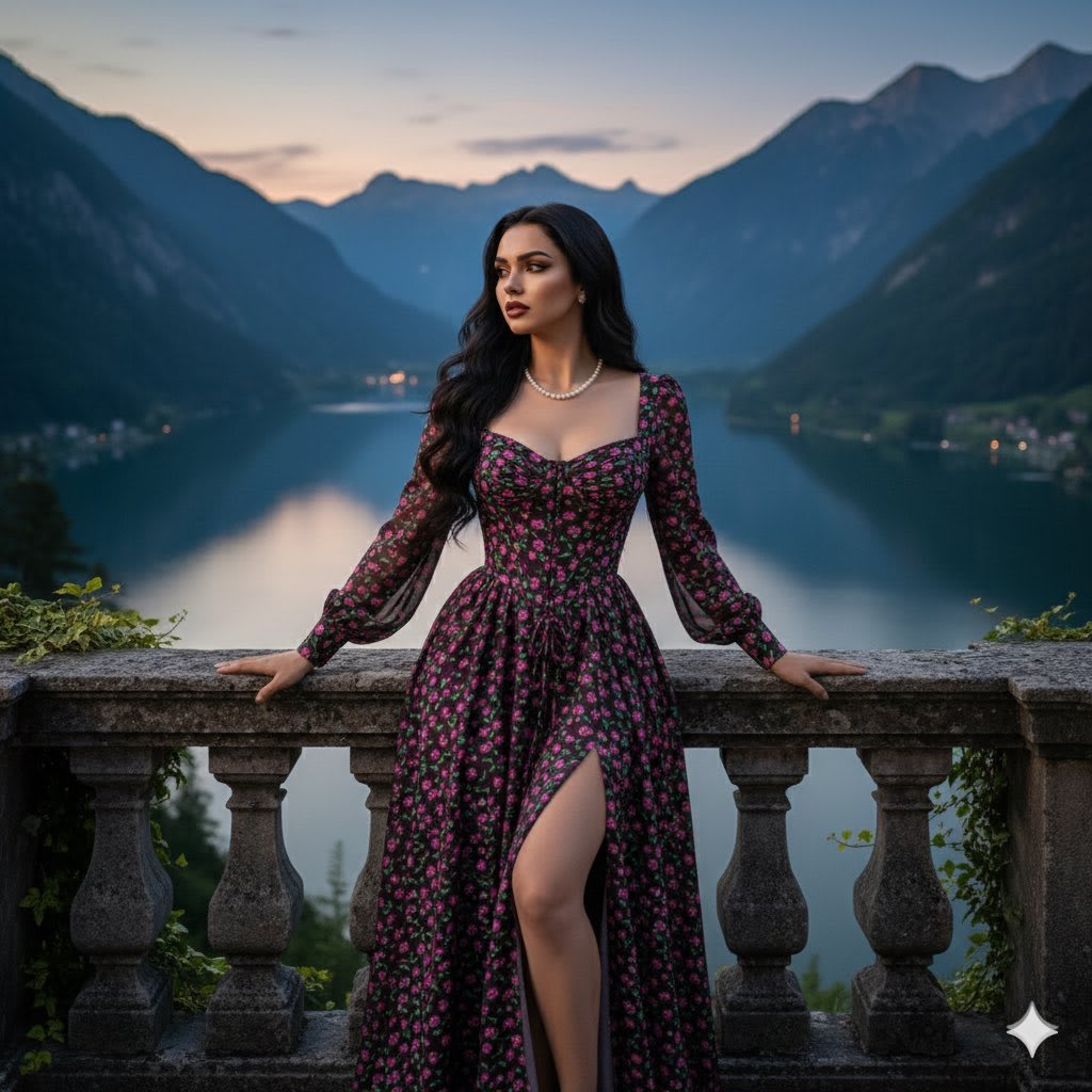 • Subject: The woman has long and dark hair and wears a dark purple dress with a pattern of pink and bright green flowers. This gown has long sleeves, long sleeves, a ruched corset with dasi detail, and a front slit. Dia melihat ke samping, jauh dari kamera, dengan ekspresi jukean or melamun. She also appears to be wearing a simple pearl necklace."