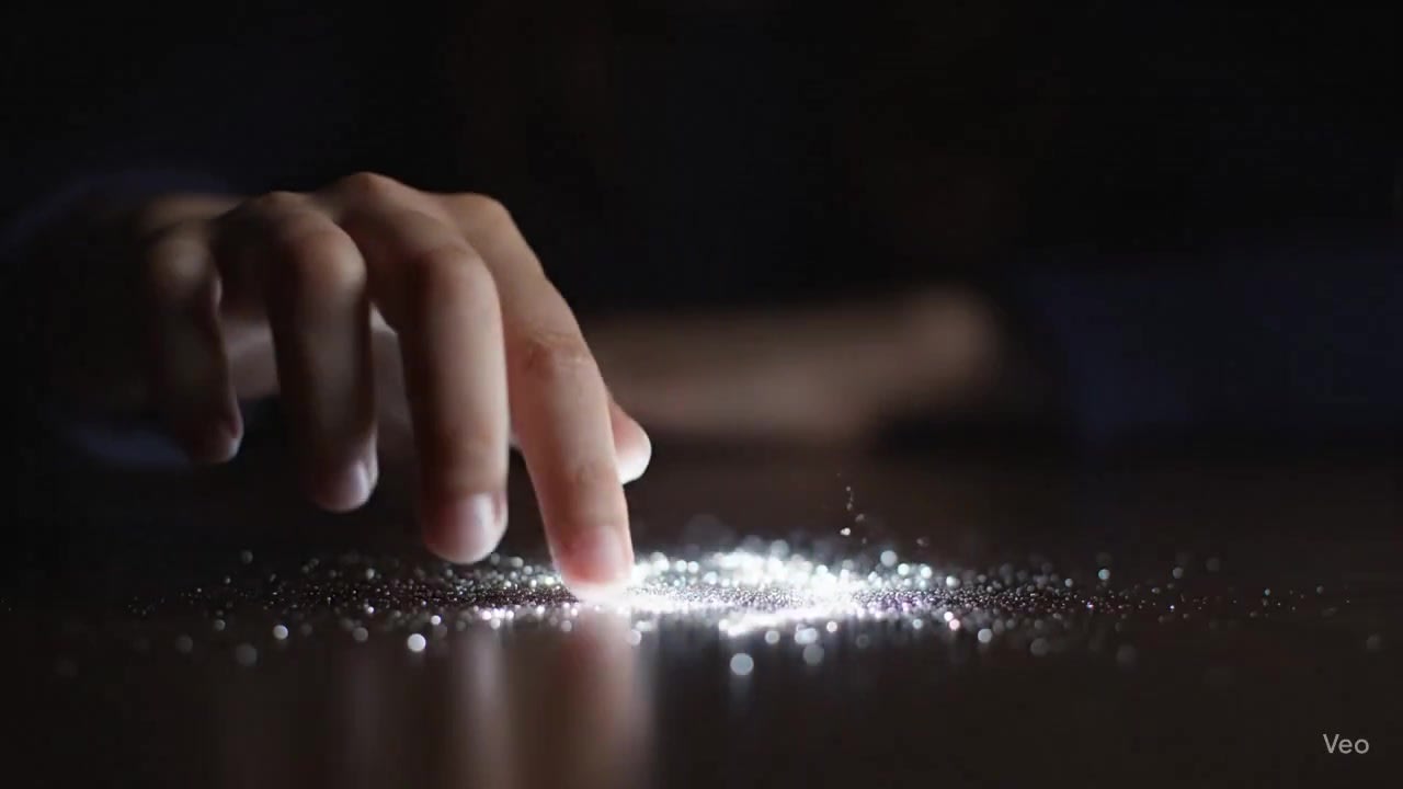 "description": "A girl's delicate hand interacting with a dynamic, living constellation of glowing dust particles on a tabletop.",