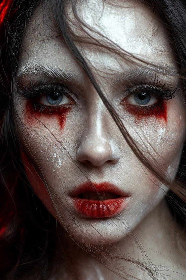 A hauntingly beautiful close-up portrait of a pale-skinned woman with striking blue eyes, accentuated by dramatic, blood-red tears and white face paint. Her dark hair is swept across her face, adding to the intense and unsettling atmosphere. The crimson red lips and smudged eye makeup create a powerful blend of vulnerability and dark allure. Her direct gaze is captivating, drawing the viewer into a world of dramatic emotion and artistic expression, conveying a sense of sorrow mixed with an ethereal beauty."