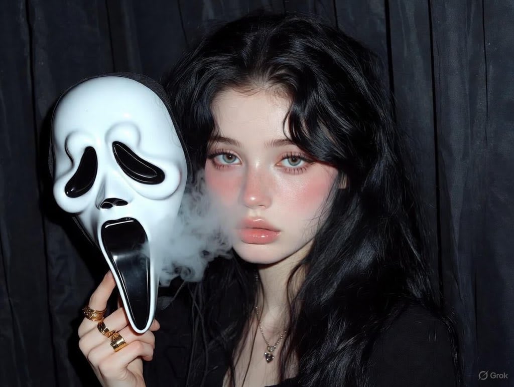 "props": "White 'Ghostface' mask (horror film series) held partially covering face",
