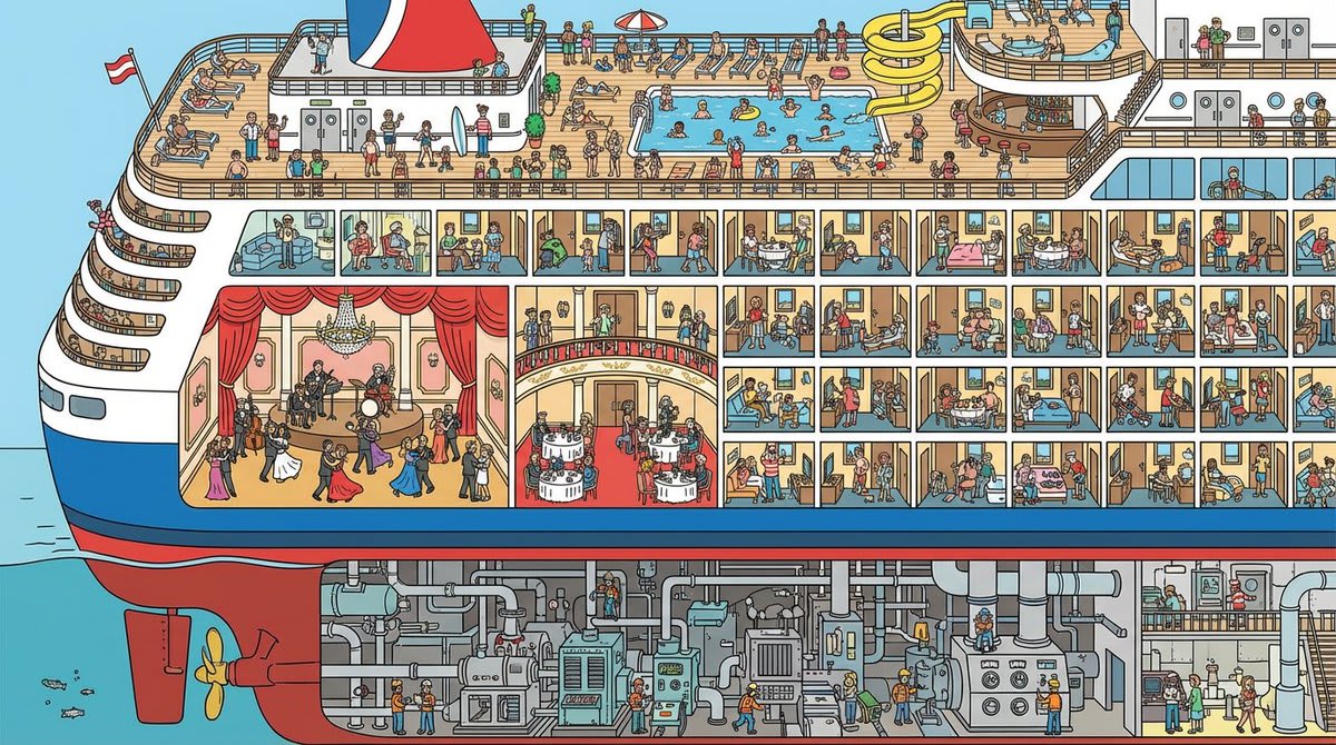 "A cutaway illustration of a cruise ship. We see the engine room, the ballroom, the pool deck, the cabins. Tiny people doing different things in each room. 'Where's Waldo' level of detail. Vector art style."
