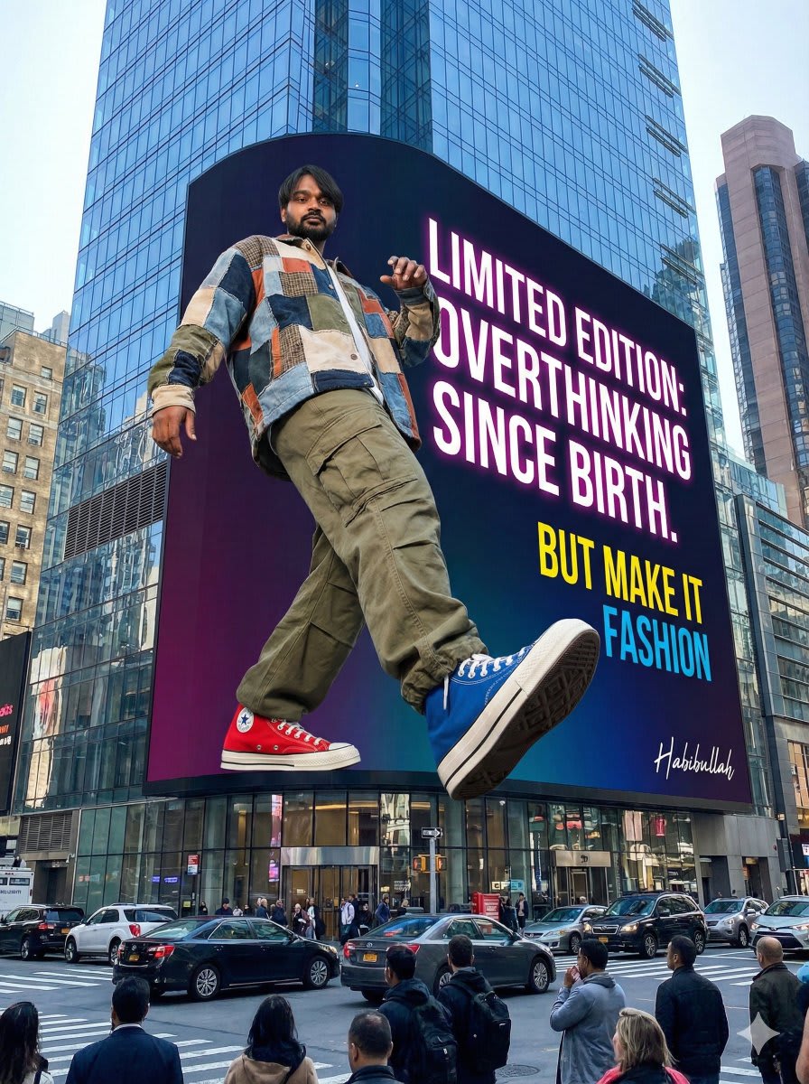 "A giant futuristic 3D fashion billboard installed on the side of a modern high-rise building in a busy urban street. On the 3D billboard is a confident man (from the uploaded image) styled in a bold, fashion-forward streetwear look — oversized jacket, cargo pants, and mismatched or random Converse-style sneakers. His pose is powerful and stylish, with one hand or shoe extending slightly outward from the frame, creating a realistic 3D pop-out effect as if he is stepping out of the billboard. Next to him, large premium-fashion typography reads: “LIMITED EDITION: OVERTHINKING SINCE BIRTH.” and below it, the tagline “BUT MAKE IT FASHION” in a contrasting modern layout. The visual tone blends luxury fashion aesthetics with humorous Gen-Z energy — photorealistic, stylish, meme-inspired, and culturally modern. Rendered in ultra-realistic detail. Vertical aspect ratio 3:4."