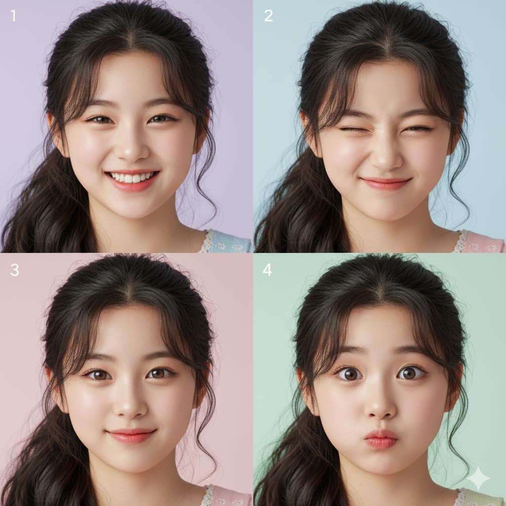 "A collage of four ultra-realistic, 8k resolution close-up portraits of a young Korean girl, showcasing distinct and adorable facial expressions: a bright, happy smile; a playful wink; a gentle, sweet gaze; and a cute, surprised/pouting look. Her dark hair is styled naturally, and she has light, youthful makeup. Each portrait features a soft, blurred, pastel-colored background. The lighting is soft, flattering, and high-key. Portrait photography"