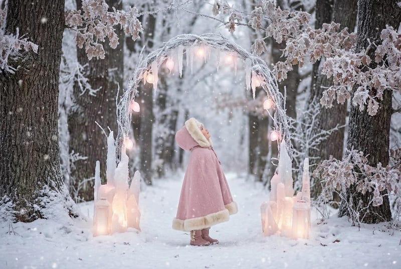"An Enchanted Winter Fairytale featuring [a small child in a fur-lined cloak], set in a magical forest blanketed in snow and sparkling ice. Use soft [powder pink] and [frosted cream] to enhance the whimsical and fantastical mood."
