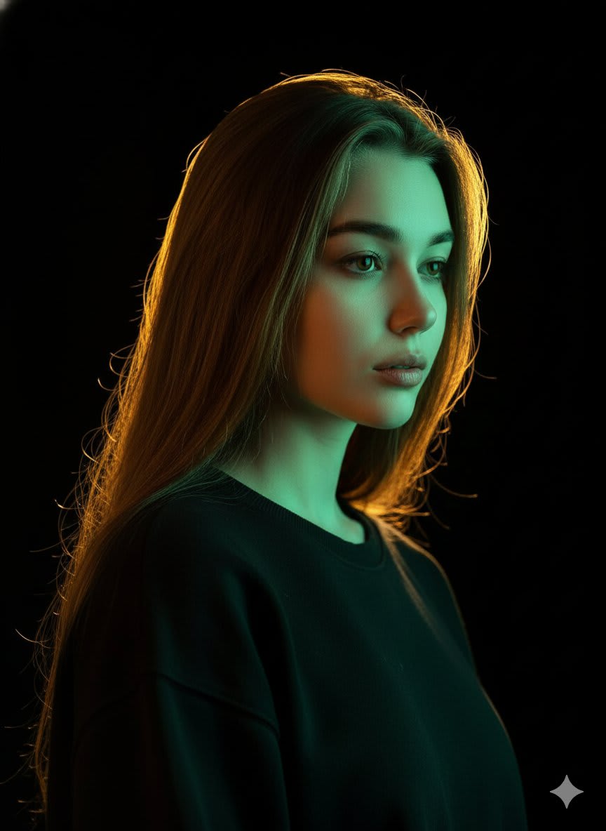 "Ultrarealistic artistic portrait of the model from the reference photo, preserving all real features. Wearing a stylish black sweatshirt, hair glowing with golden backlighting, contrasted by cool green light on the face and chest, against a deep black background. The model is posed slightly in profile, head turned gently to the side with a thoughtful expression, avoiding direct eye contact with the camera. [do not alter the face in the submitted photo]"
