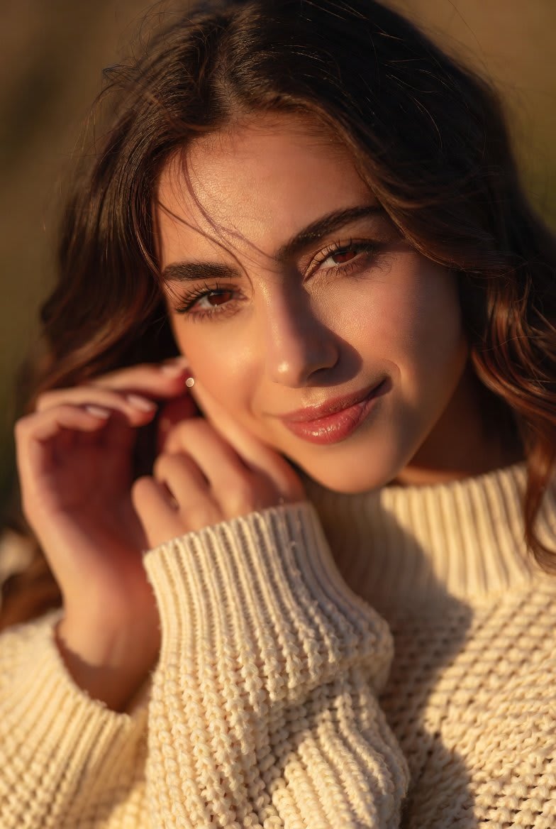 "Expression_Gesture": "Eyes half-closed in a relaxed smile while gently adjusting her earring"