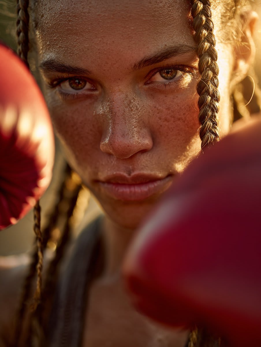 "A cinematic ultra-realistic portrait of a female boxer in golden hour light, her braided hair damp and glistening, skin covered in fine sweat illuminated by warm sunlight cutting across her face, eyes locked with intense focus framed by crimson gloves in the foreground. Captured on Sony A7R V with 85mm f/1.8 lens, ISO 100, shutter 1/500s, white balance 4800K. The depth isolates her face while gloves blur slightly toward camera, golden hues blending with earthy background tones. Lighting emphasizes texture each pore and droplet visible, no smoothing. The atmosphere feels raw, emotional, and cinematic, evoking inner strength anco Benzerlerini bulion. Graded in Kodak Vision3 250D film tone with soft halation, warm contrast, and lifted shadows for organic realism. --ar 3:4"