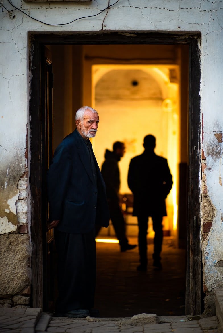 "Bathed in the gentle warmth of the setting sun, an elderly man stands quietly in a weathered doorway,a silent witness to time and memory.