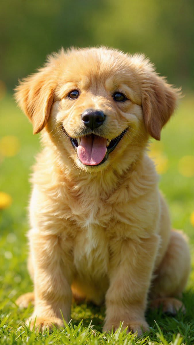 "prompt": "Ultra-realistic close-up photo of an adorable golden retriever puppy sitting on bright green grass under warm daylight. The puppy looks joyful with its tongue slightly out and a playful sparkle in its eyes. Its fur is soft, fluffy, and detailed with golden tones that catch the sunlight beautifully. Around it are vivid green grass blades, a few yellow flowers, and soft natural shadows. The atmosphere feels fresh, happy, and full of positive energy — a perfect sunny day moment.",